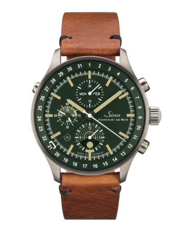 Automatik, Valjoux 7751, besonders kratzfestes Edelstahlgehäuse mit TEGIMENT-Technologie im Durchmesser von 44 mm, Ar-Trockenhaltetechnik, dadurch erhöhte Funktions- und Beschlagsicherheit, dunkelgrünes Zifferblatt mit elfenbeinfarbener Nachleuchtfarbe, Mondlichtanzeige, Indizes sowie Stunden- und Minutenzeiger mit Leuchtfarbe belegt, 24-Stunden-Anzeige mit integrierter Tag-Nacht-Anzeige, mit braunem Rindslederarmband in Vintage-Optik, Dornschließe, Saphirglas und Saphirglasboden beidseitig entspiegelt, unterdrucksicher, bis 20 bar wasserdicht.